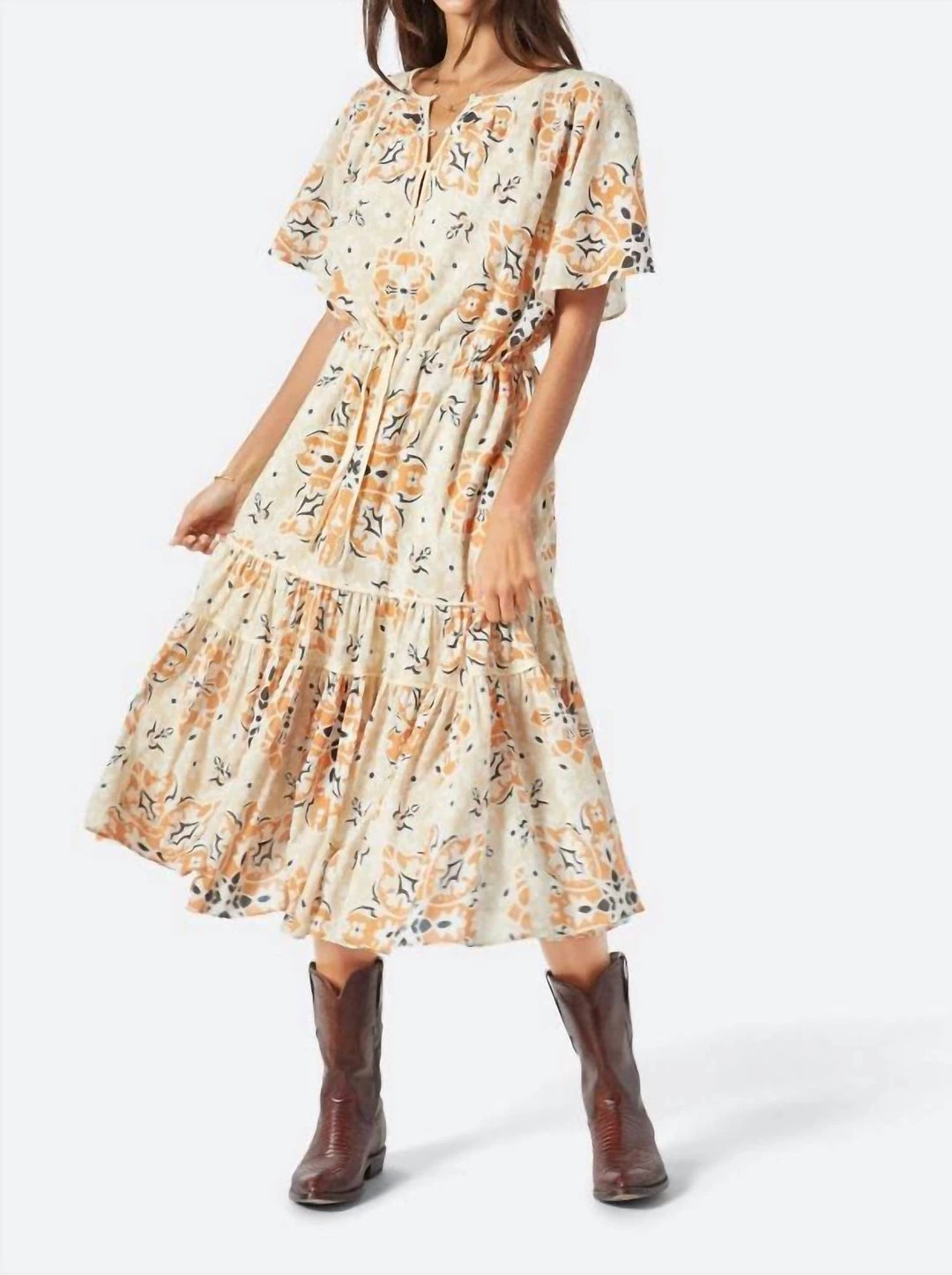 A dress with a retro flair like no other, The Bellsa flows seamlessly with its Ojai Tile pattern and tiered silhouette on Washed Cotton Voile. This whimsical dress features a drawstring at the waist for a flattering shape and looks great with sandals or a pair of sneakers. 100% cotton Hand wash warm. Only non-chlorine bleach if needed. Lay flat to dry. Cool iron if needed or dry clean.