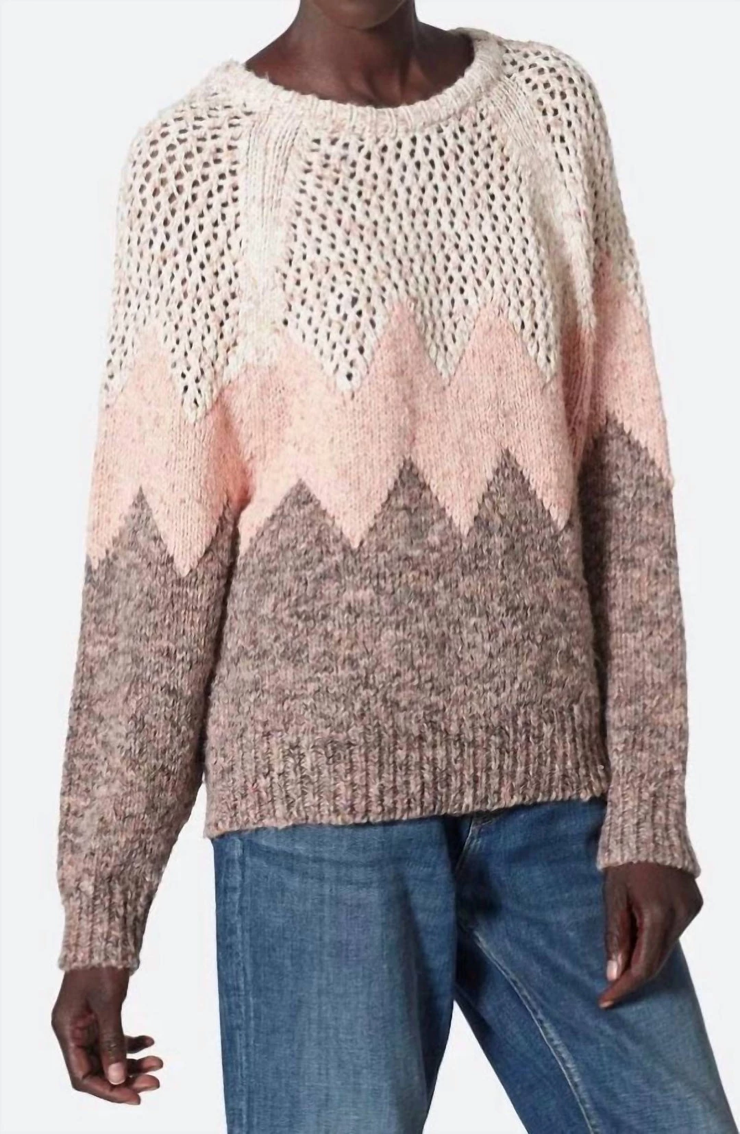 Shades of pink, mix of knits in a zig zag pattern. More generous fit.