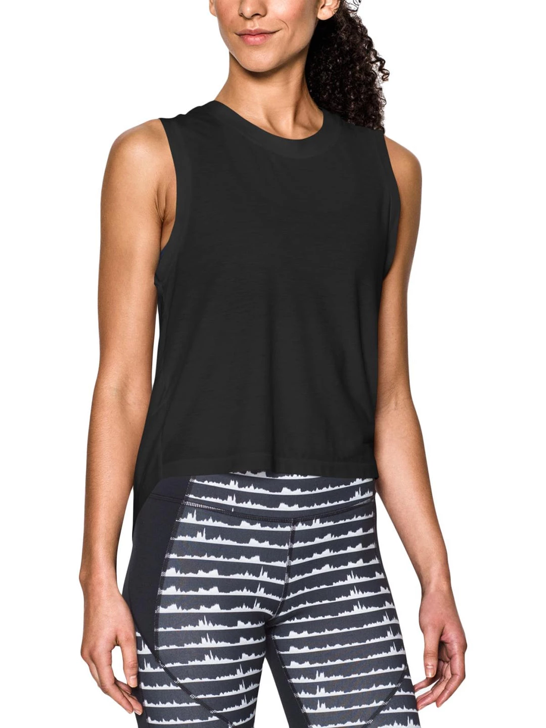 Break a sweat in this lightweight fitness muscle tank by Under Armour. Made with MATERIAL COMP. The super light, sweat wicking fabric and sleeveless construction will keep you cool all throughout your workout. Pair it with your favorite sports bra and leggings before heading out to the gym. It’s drapey back and seamed details offer feminine athletic style. Pullover. This tank top is guaranteed authentic.