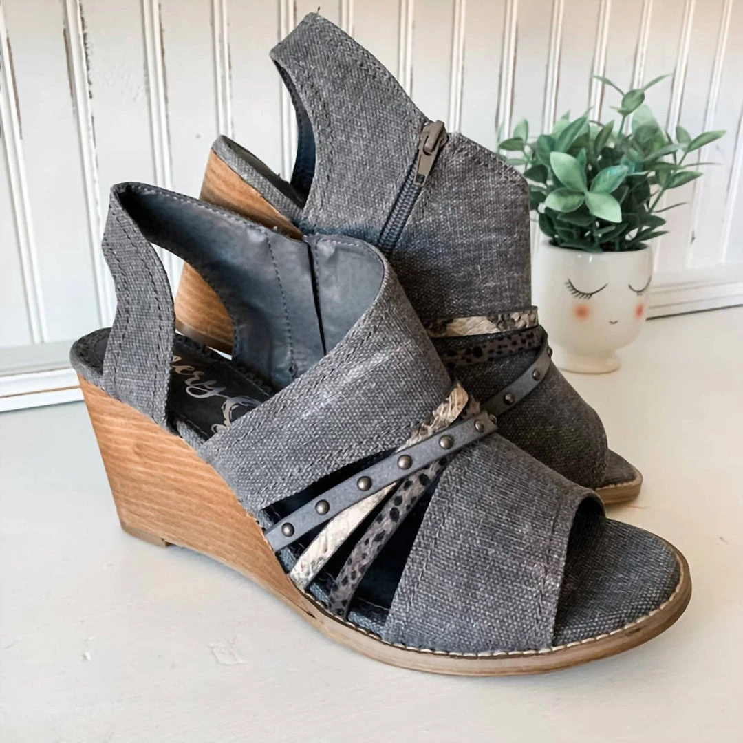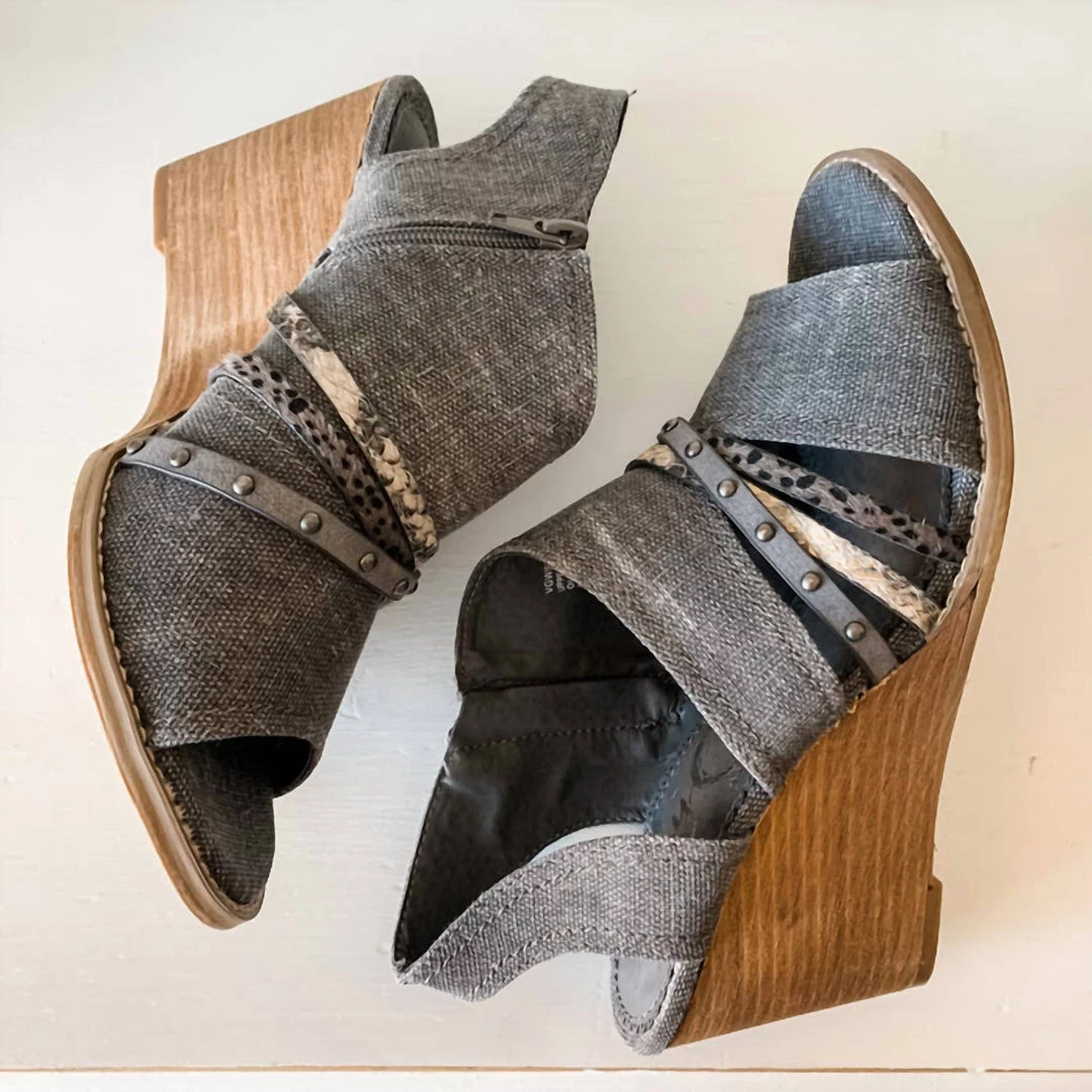 Comfort fit bootie.2.5″ Wedge HeelMan Made MaterialsCanvas OuterSide Zipper for easy entryTrue to size.Â